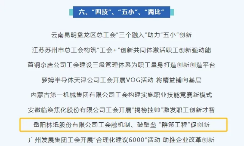 中國(guó)紙業(yè)所屬岳陽(yáng)林紙入選全國(guó)工會(huì)重點(diǎn)工作創(chuàng)新案例